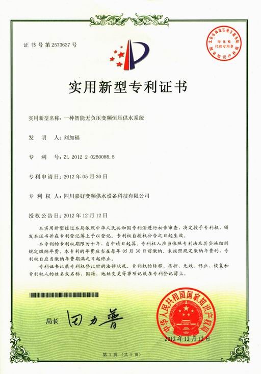 新闻标题:热烈祝贺 “嘉好”牌智能无负压变频恒压供水设备 于2012年-12月-12日荣获国家实用新型专利产品