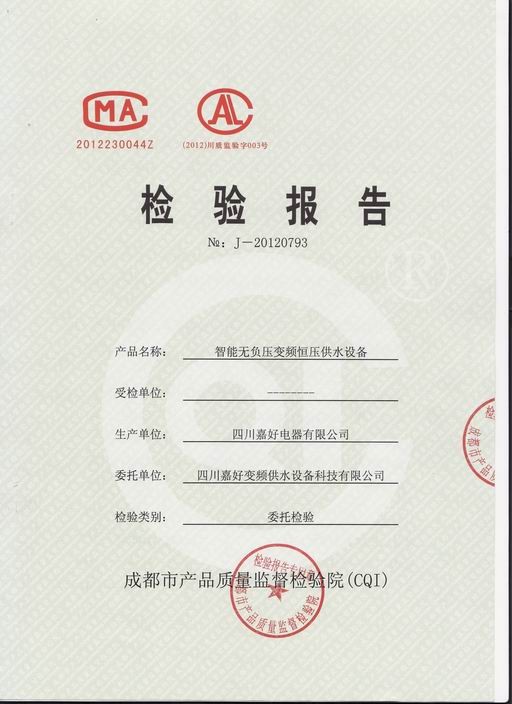 新闻标题:我公司“嘉好”牌智能变频恒压供水产品通过成都市产品质量监督检验院的检验并荣获检验报告报告