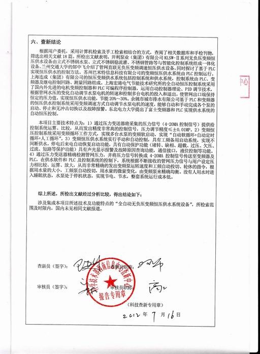 新闻标题:我公司的“嘉好”牌智能变频恒压供水产品荣获中华人民共和国科学技术部的查新报告