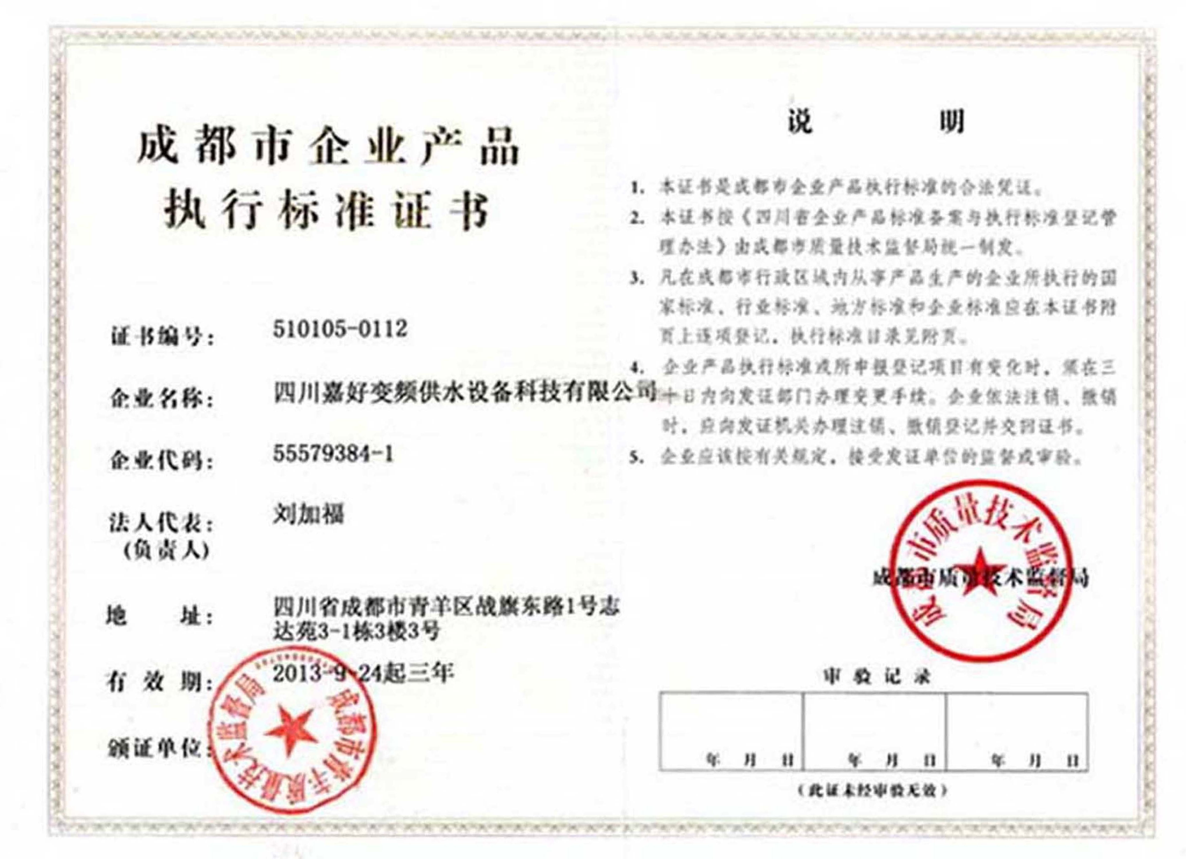 新闻标题:热烈祝贺 “嘉好”牌智能无负压变频恒压供水设备 唯一获得成都市企业产品执行标准证书